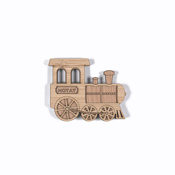 A wooden train magnet inspired by the steam trains in our collection.