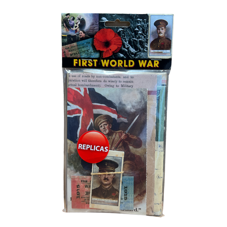 Our First World War Replica Pack is a collection of high quality reproduced war paper memorabilia, packaged in a clear bag with header card.