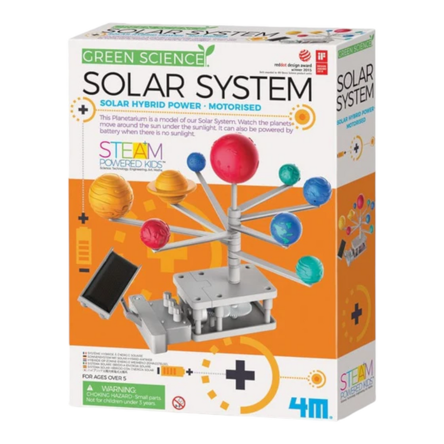 This solar hybrid planetarium rotates with the power of the sun itself or the back-up battery. This planetarium is a model of our solar system. A fun and educational green science kit from 4M. Includes solar system pieces, solar panel and detailed instructions. Requires 1 AAA battery (not included).