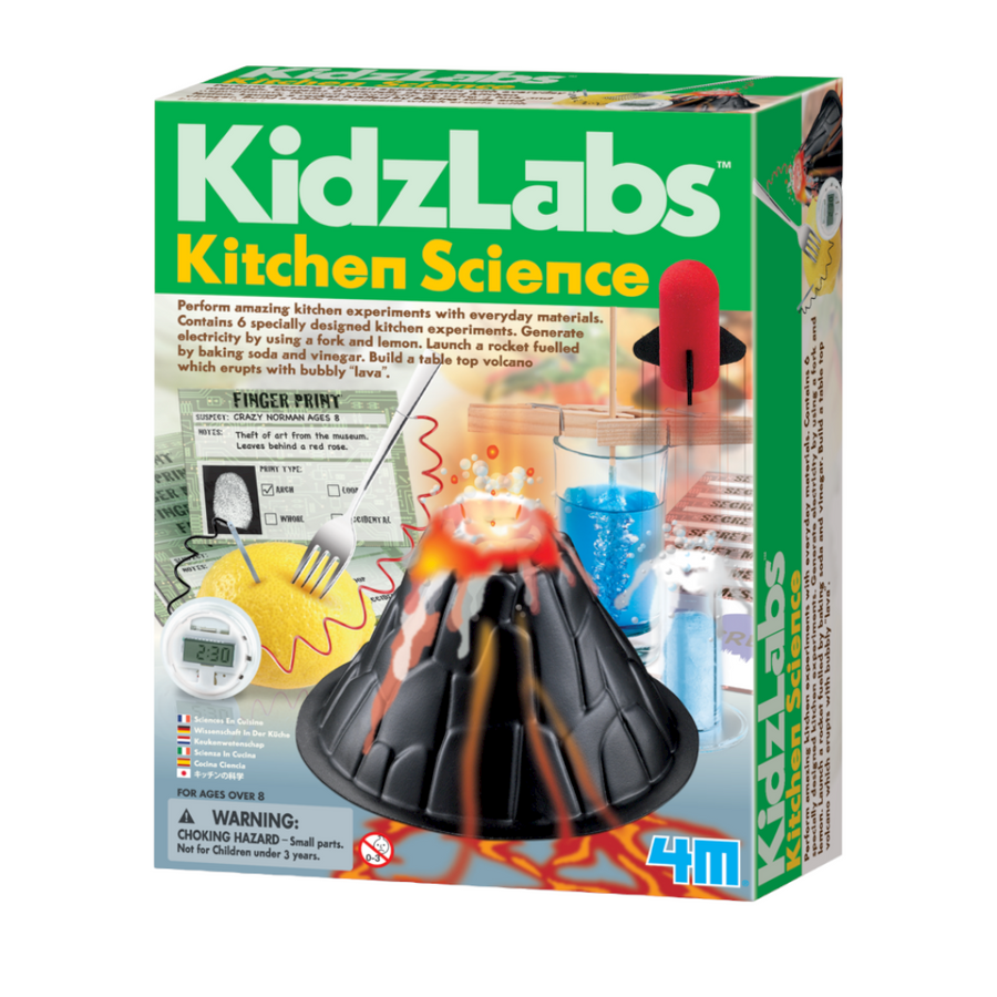 Perform amazing experiments with everyday materials. Contains 6 specially designed kitchen science experiments. Generate electricity by using a fork and lemon. Launch a rocket fuelled by baking soda and vinegar. Build a table top Volcano which erupts with bubbly lava and more.