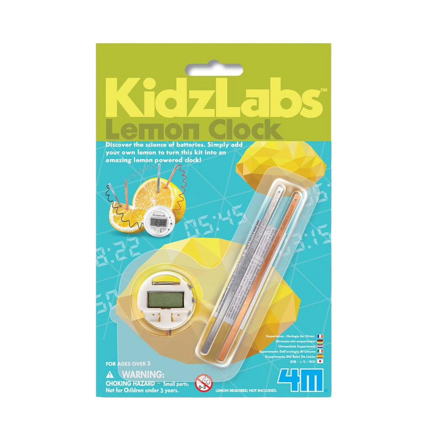 Discover the science of batteries. Simply add your own lemon to turn this kit into an amazing lemon powered clock!
