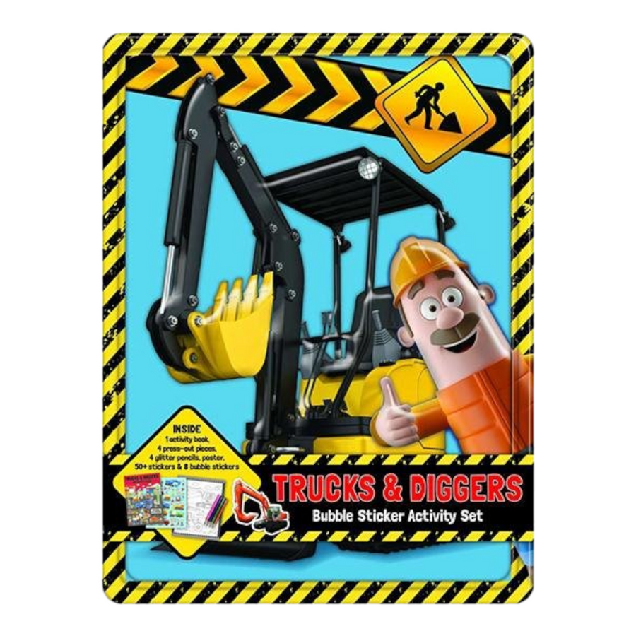 Kids will go crazy for this awesome Truck and Diggers tin full of entertaining activities! Each embossed keepsake tin is packed with a coloring book, press-out play pieces, a sticker sheet featuring 50+ stickers and 3D bubble stickers, four pencils, and a double-sided poster to keep them busy for hours.